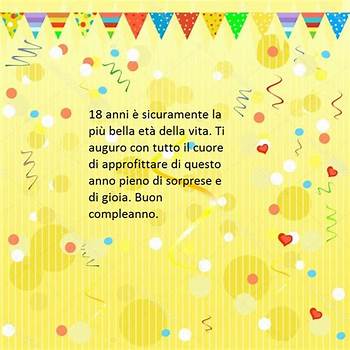 Il compleanno dei 18 anni è sempre molto sentito, dato che si tratta di un passaggio importante nella vita degli adolescenti che finalmente diventano adulti (almeno per la legge).Il nostro augurio è che tu possa percorrere serenamente il sentiero della vita, a volte.. Auguri 18 anni 120 immagini, video e frasi per i 18 anni da dedicare a Tanti auguri per i tuoi primi 18 anni. Il mio augurio per te nel giorno del tuo compleanno è che tu sia, ora e per. Ricordo il giorno in cui. Frasi di auguri per i 18 anni; Abbiamo vissuto con te le tue gioie, abbiamo esultato per le.... . Sei solo un bambino di 10 anni con 8 anni.