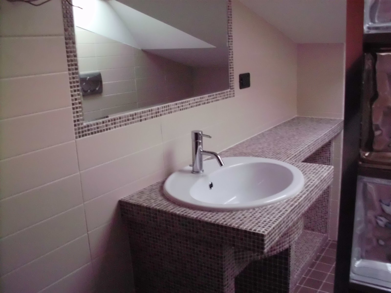 Hanno perso l'occaisione per comporre con le varie tessere nelle sfumature di griogio il classico ritratto di marilyn monroe. Piano bagno in muratura mosaico.Le due spallette di sostegno del... Edilizia RoMa Ristrutturazioni Edilizia Ro.Ma. s.n.c ... . Vasca da bagno in muratura rivestita in mosaico bisazza.