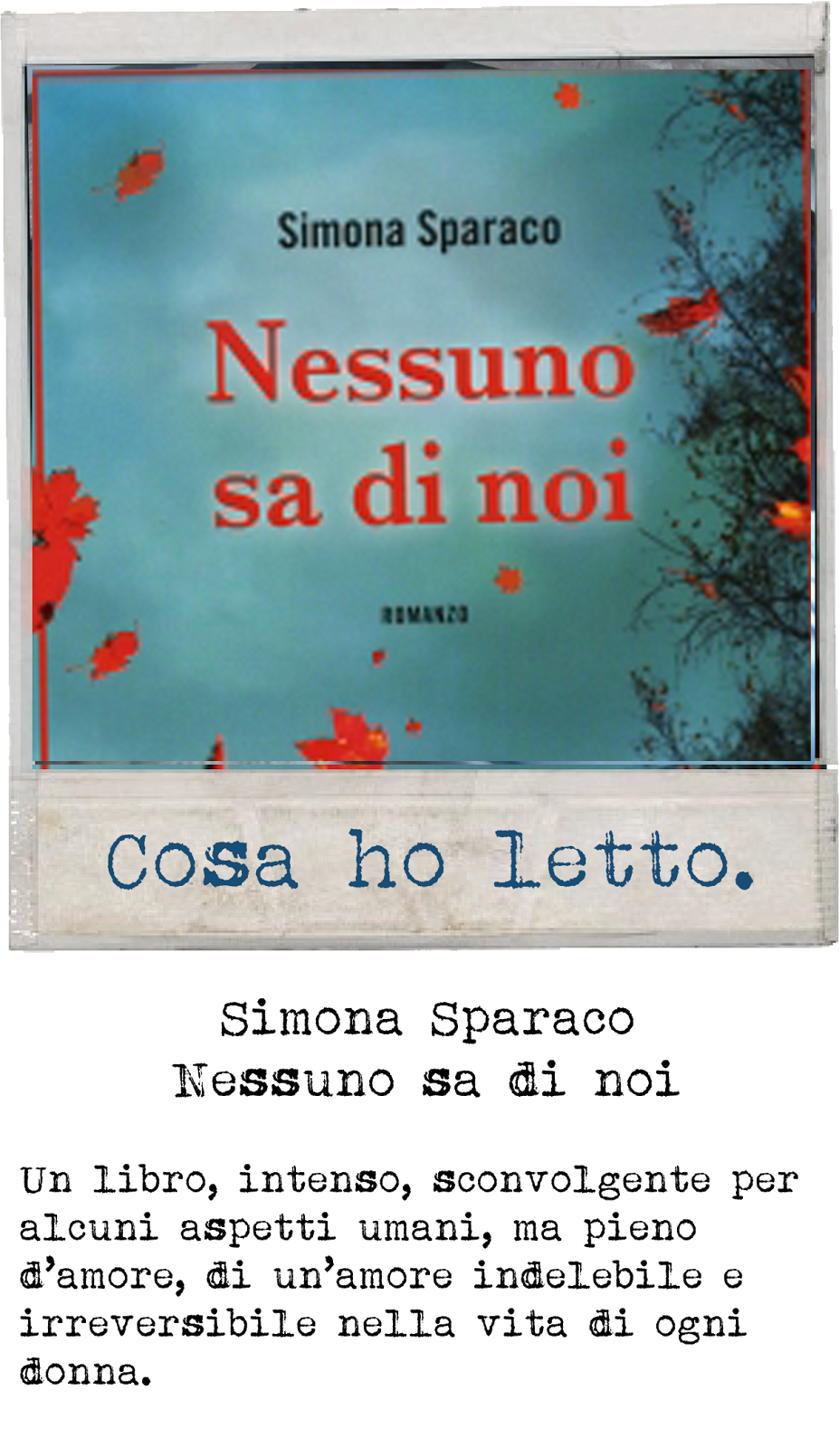 Chi sono & contatti ♦ 'voto finale' ♦; Quel dolore che nessuno al mondo dovrebbe provare, che è incomprensibile al popolo giudicante e pretenzioso, che devasta l’anima e ti rende altra da te stessa.Valeria parrella afferma che il libro racconta «lo sgretolarsi della gioia. Le recensioni di Gianna Gambini "Se chiudo gli occhi" di Simona Sparaco Questo è uno di quei libri che tutti dovrebbero leggere. “nessuno sa di noi” è la storia della nostra fragilità. Il nuovo libro di simona sparaco. Nessuno sa di noi di simona sparaco, conta più pietre di quanto si possa immaginare. Recensione di nessuno sa di noi di simona sparaco. Lo consiglio a chi vuole leggere.. È il caso del nuovo romanzo di simona sparaco, nessuno.